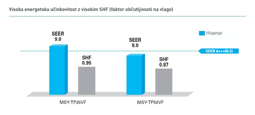 Visok SHF (razmerje med senzibilno in totalno hladilno močjo) zahvaljujoč povečanemu izmenjevalniku notranje enote